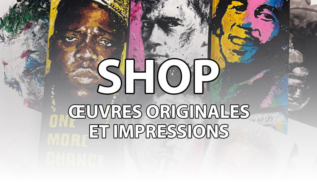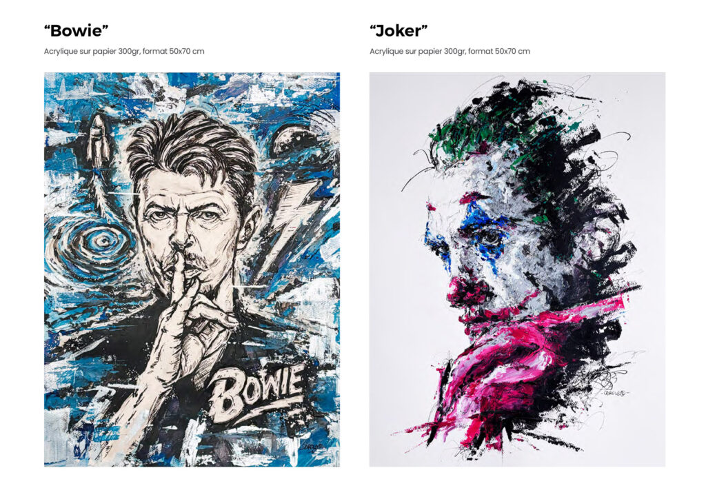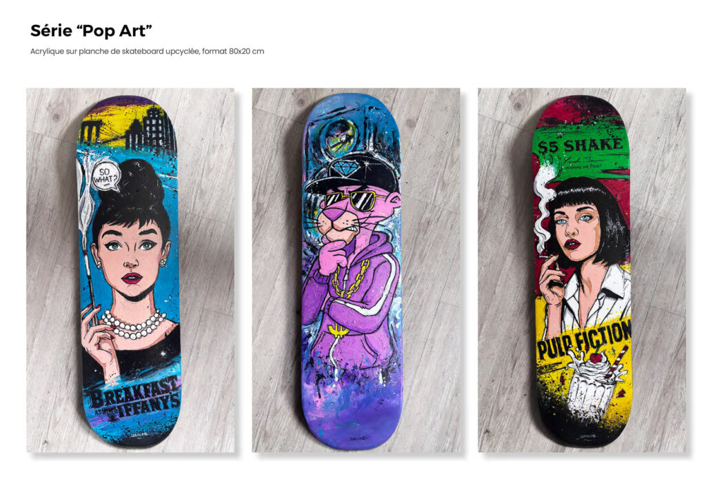 Des compositions qui célèbrent les icônes culturelles, mais pas que, avec la profondeur des regards et la diversité des supports, tels que des planches de skate ou des vinyles, avec un jeu vibrant de couleurs et de contrastes. Mes œuvres révèlent un univers artistique qui mêle force et émotion.